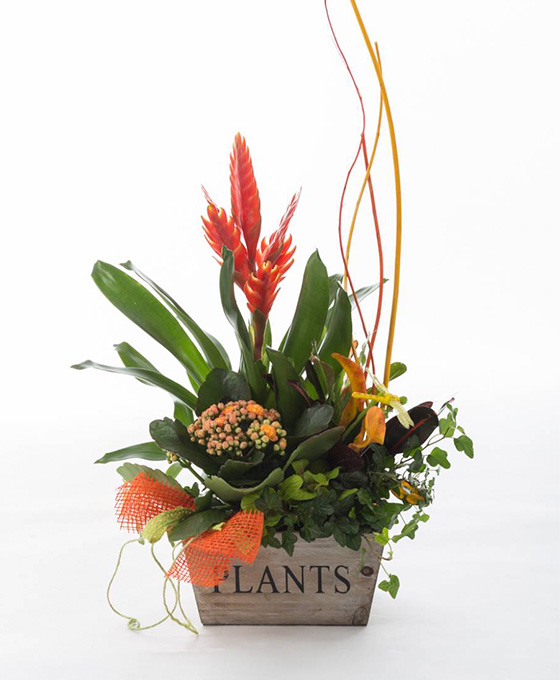 Montaje de plantas de interior y de temporada . Combinación de plantas verdes y plantas con flor
